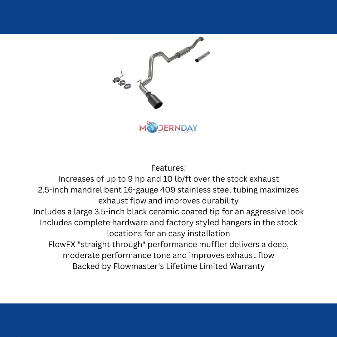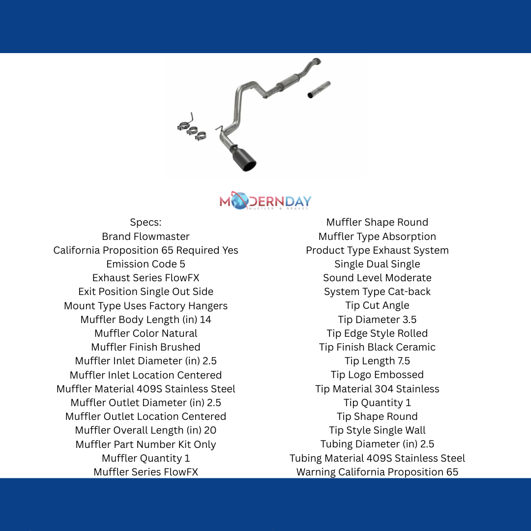 - FlowFX "straight through" performance muffler delivers a deep, moderate performance tone and improves exhaust flow