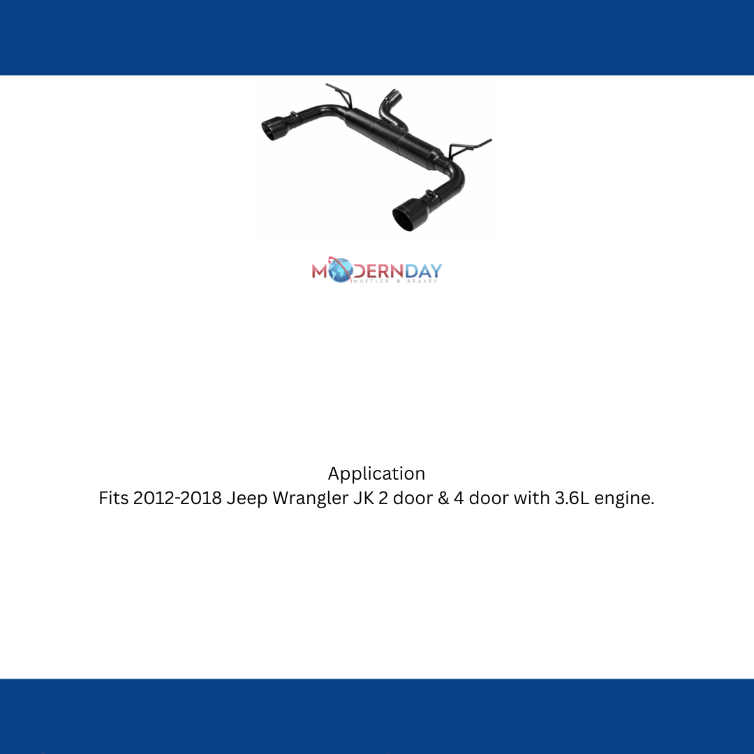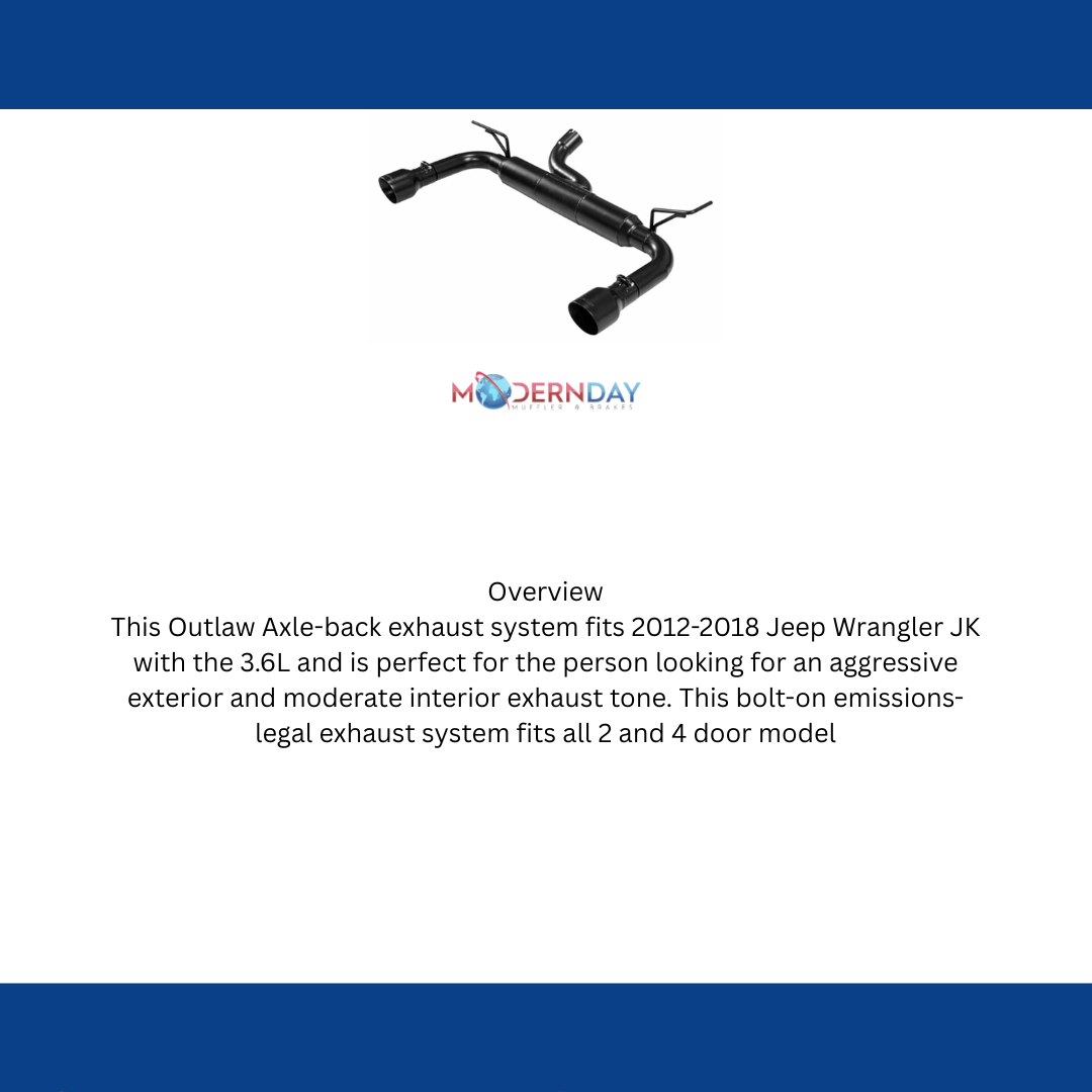 This Outlaw Axle-back exhaust system fits 2012-2018 Jeep Wrangler JK with the 3.6L and is perfect for the person looking for an aggressive exterior and moderate interior exhaust tone. This bolt-on emissions-legal exhaust system fits all 2 and 4 door model