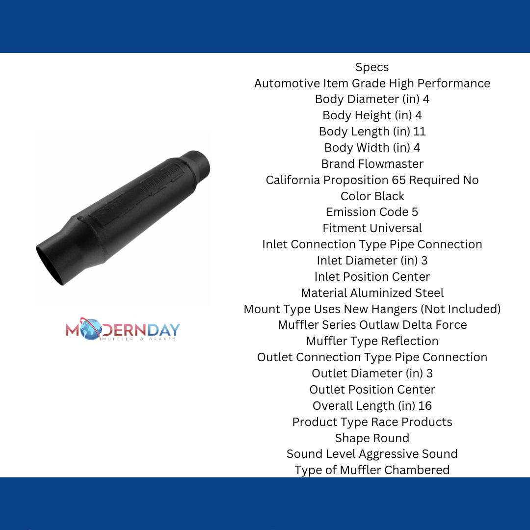 Outlaw mufflers are designed to be connected directly to the header collectors or can be added into an existing exhaust system. Recommended for racing applications where a muffler is required without a set decibel limit to be met. Please call the Flowmast