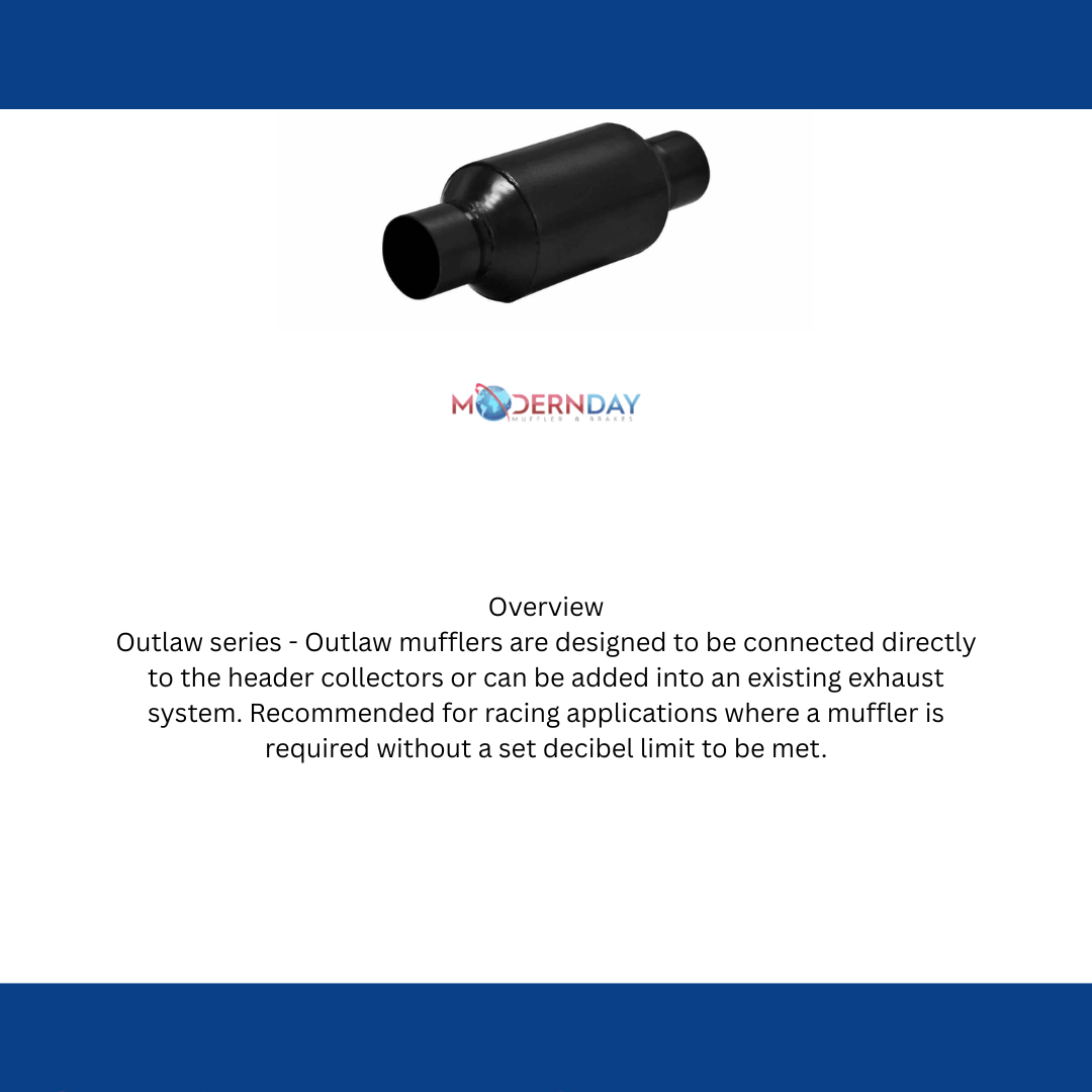 Outlaw series - Outlaw mufflers are designed to be connected directly to the header collectors or can be added into an existing exhaust system. Recommended for racing applications where a muffler is required without a set decibel limit to be met. Please c