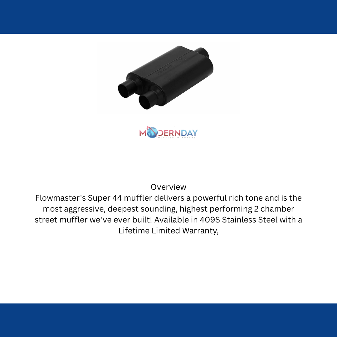 Flowmaster's Super 44 muffler delivers a powerful rich tone and is the most aggressive, deepest sounding, highest performing 2 chamber street muffler we've ever built! Available in 409S Stainless Steel with a Lifetime Limited Warranty, these mufflers feat