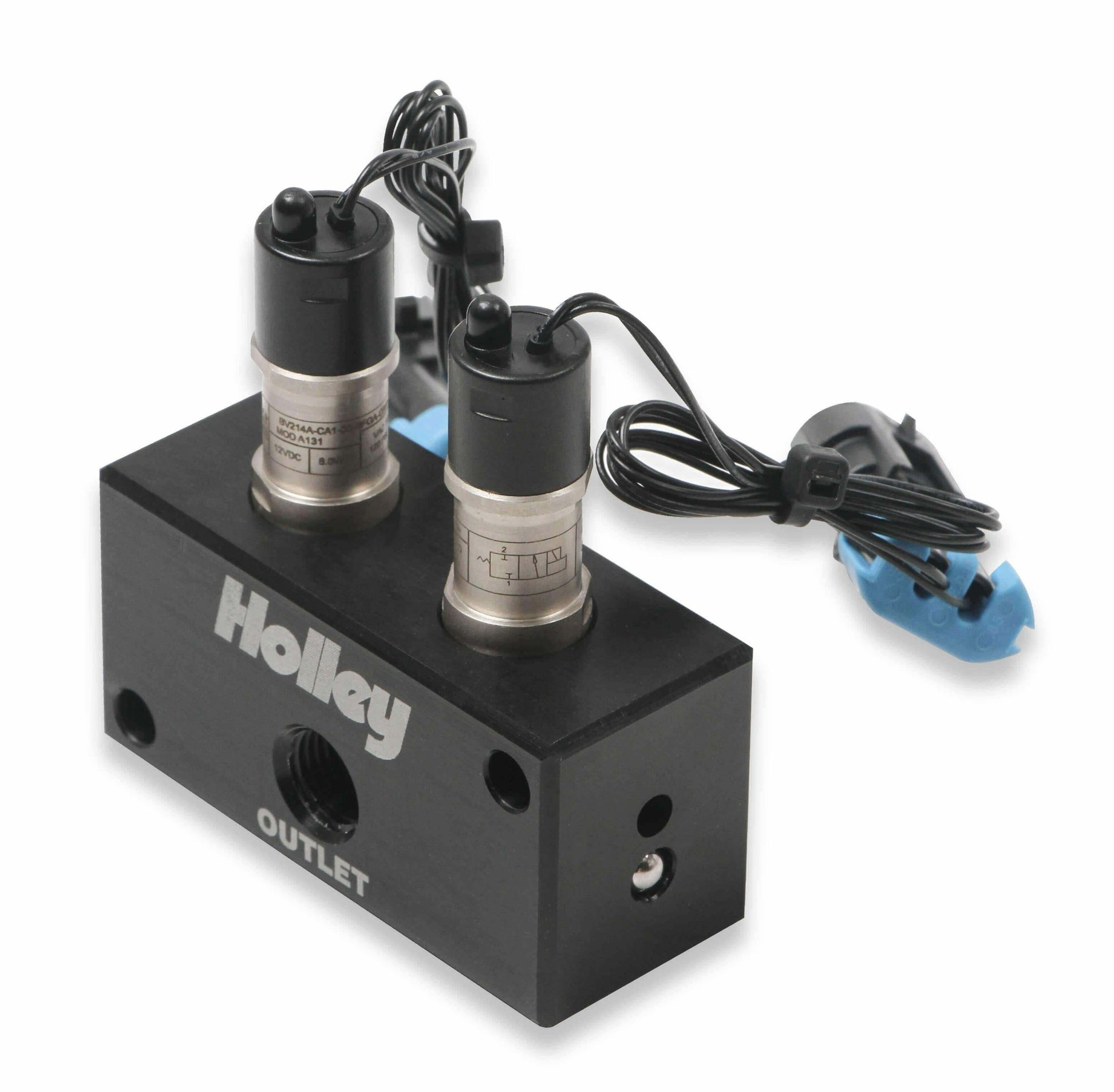 Introducing the newest development from the Holley EFI engineering team. The Holley EFI High Flow Dual Port Boost Control Kit. This kit contains a set of pre-installed high flow solenoids, which feature a dual O-ring sealing design, preventing any boost leaks out of the manifold. A black anodized billet aluminum manifold, with built in mounting provisions. Two pre-terminated connectors for a quick installation, and extra pins for those of you wanting to cut the harnesses to custom lengths. Finally two 1/4" push-lock fittings to simplifying the installation process. The Holley EFI boost control proprietary solenoid design flows nearly 40% more than comparable designs and up to 90% more than conventional 3-port boost control solenoids.