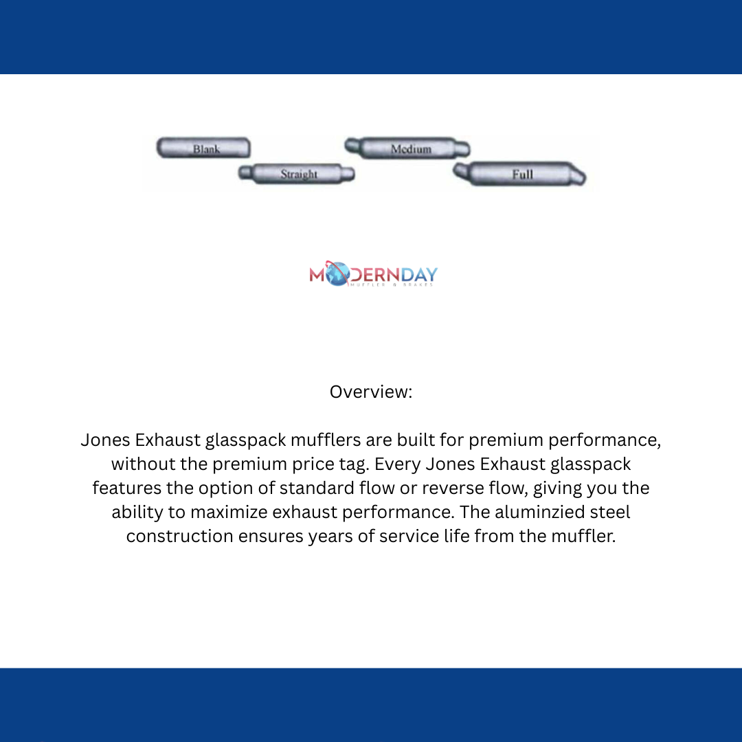 Jones Exhaust glasspack mufflers are built for premium performance, without the premium price tag. Every Jones Exhaust glasspack features the option of standard flow or reverse flow, giving you the ability to maximize exhaust performance. The aluminized steel construction ensures years of service life from the muffler.