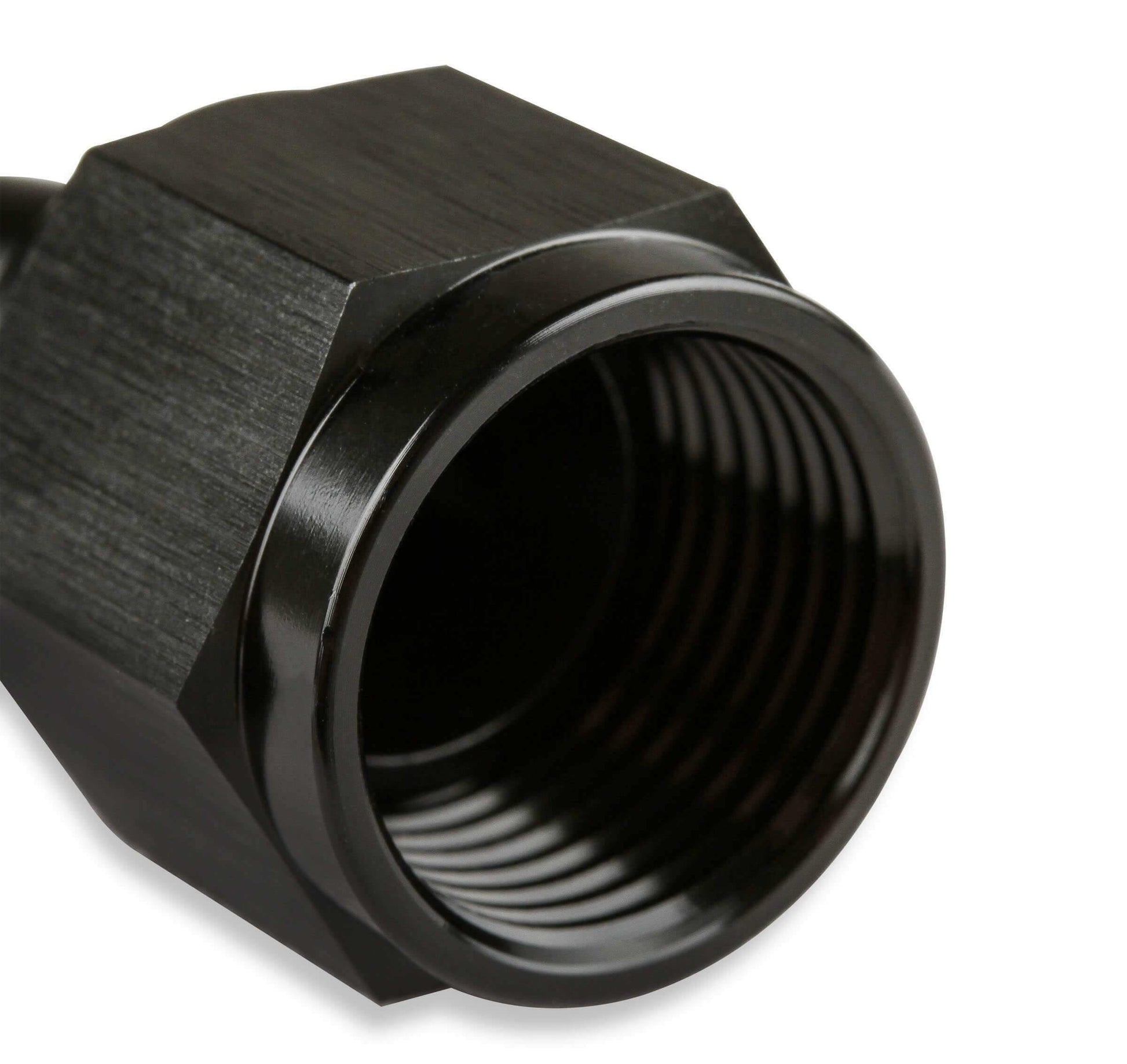 This Mr. Gasket Swivel Hose End is economically priced, manufactured from 6061 aluminum and comes in a black anodized satin finish. The satin finish with no logo looks great even when mixed with other brands of AN plumbing. Designed to use push-in AN hoses and the swivel end allows for adjustment after installation.