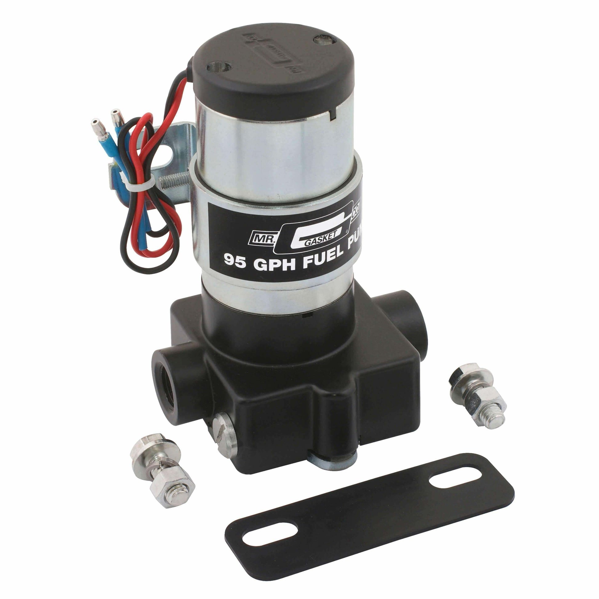 This lightweight pump includes mounting bracket and hardware and is universal for all carbureted gasoline engines. 7 PSI max. Mr. Gasket Electric Fuel Pump #95P is a gravity fed vane/rotor type high volume low pressure pump designed for street/strip applications. The operating fuel pressure is factory set at 7 PSI. We recommend a 3/8 inch i.d. (inner diameter) hose with this fuel system. Pump can also be used to transfer fuel.