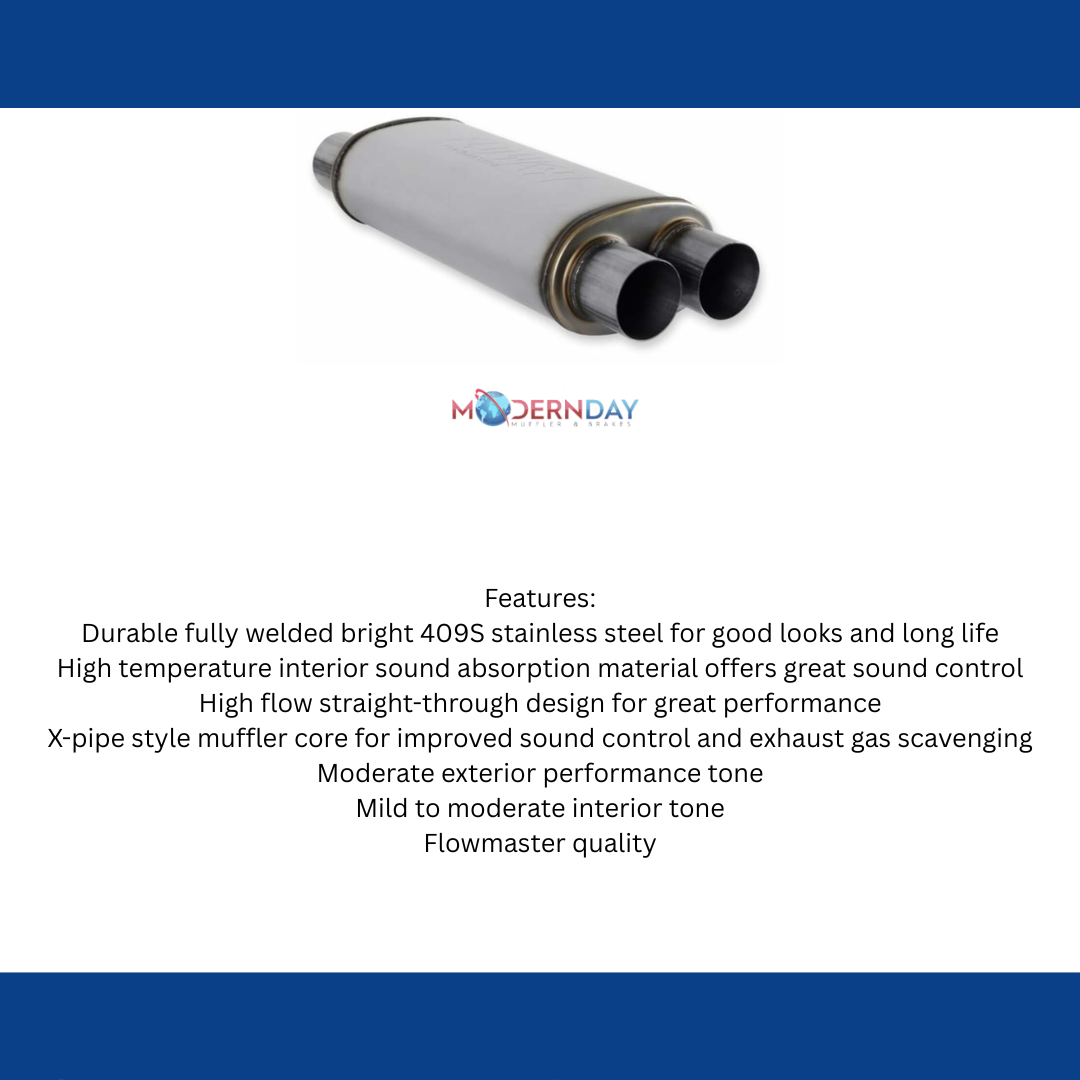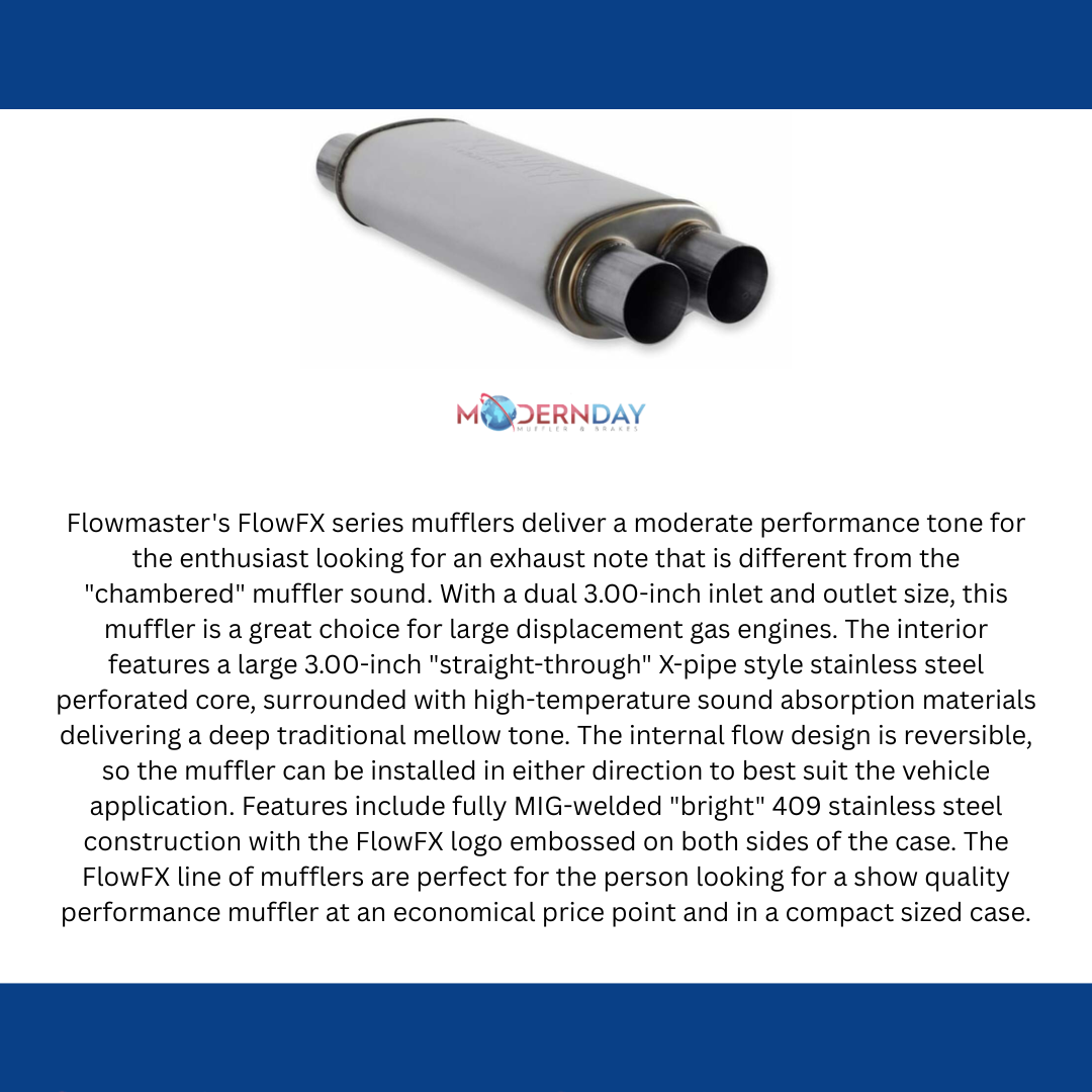 Flowmaster's FlowFX series mufflers deliver a moderate performance tone for the enthusiast looking for an exhaust note that is different from the "chambered" muffler sound. With a dual 3.00-inch inlet and outlet size, this muffler is a great choice for large displacement gas engines. The interior features a large 3.00-inch "straight-through" X-pipe style stainless steel perforated core, surrounded with high-temperature sound absorption materials delivering a deep traditional mellow tone. The internal flow design is reversible, so the muffler can be installed in either direction to best suit the vehicle application. Features include fully MIG-welded "bright" 409 stainless steel construction with the FlowFX logo embossed on both sides of the case. The FlowFX line of mufflers are perfect for the person looking for a show quality performance muffler at an economical price point and in a compact sized case.