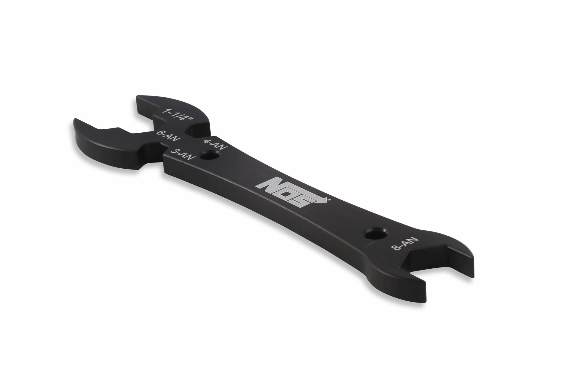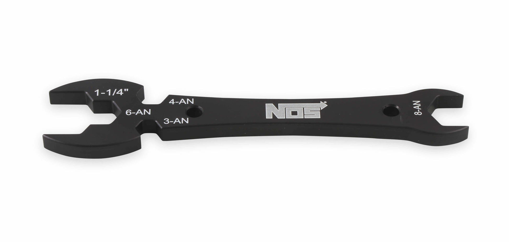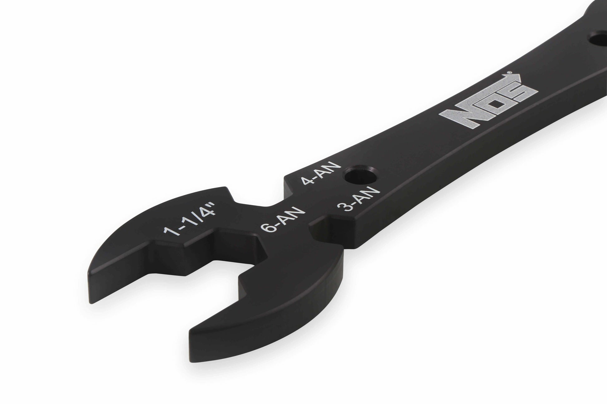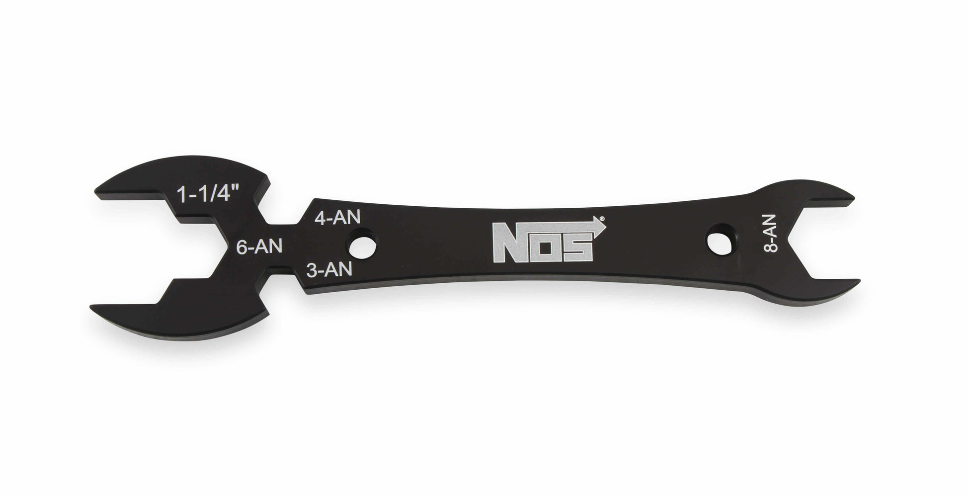 The folks at NOS have designed a custom wrench that is a must have tool for any nitrous racer. No need to pack multiple AN wrenches along with a bottle nut wrench. The NOS Bottle Nut/AN Combo Wrench is all you need. The NOS wrench combines the ability to service 3AN, 4AN, 6AN, 8AN lines and 1-1/4" bottle nuts in one handy tool. Precision machined from 6061-T6 aluminum with a black anodize and laser etched for great looks and easy size identification.