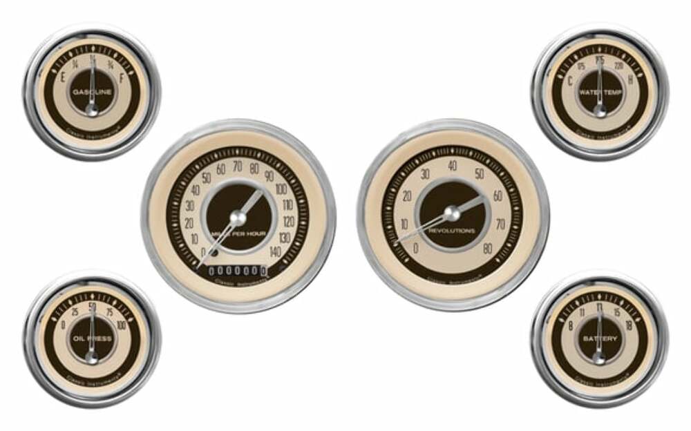 Nostalgia VT Series 3 3/8" Speedo, Tach, 2 1/8" Fuel, Oil, Temp, Volt with Stainless High Step Bezel Curved Glass Lens