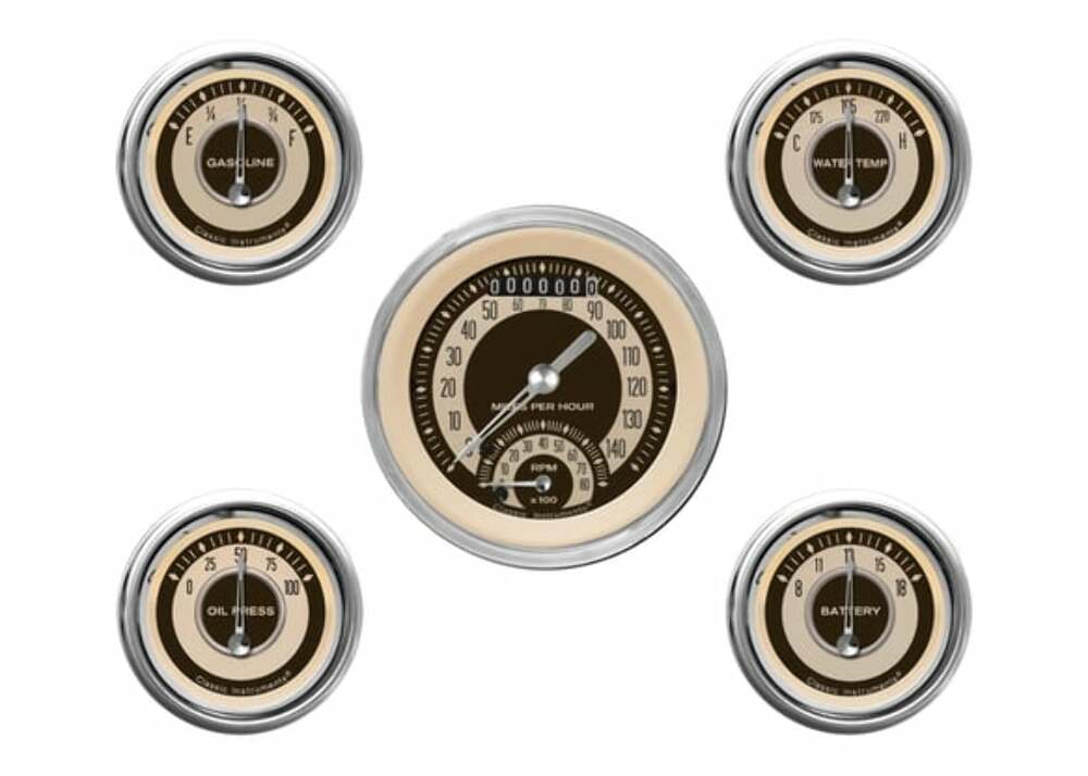 Nostalgia VT Series 3 3/8" Ultimate Speedometer, 2 1/8" Fuel, Oil, Temp, Volt with Stainless High Step Bezels and Curved Glass Lenses. Ultimate speedometer features a built-in ECM filter signal switch.
