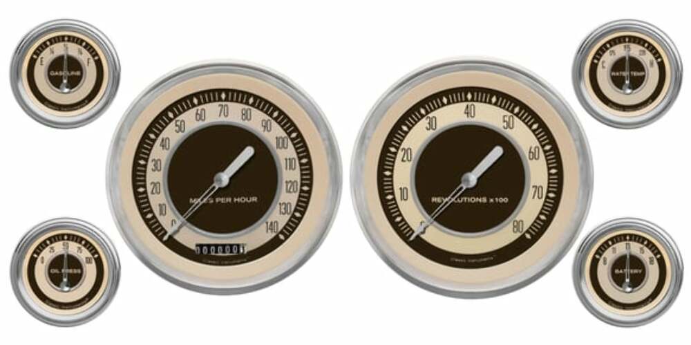 Nostalgia VT Series 4 5/8" Speedo, Tach, 2 1/8" Fuel, Oil, Temp, Volt with Stainless Low Step Bezel Curved Glass Lens