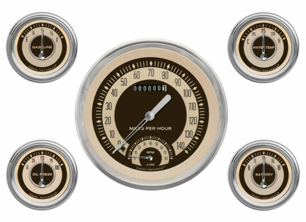 Nostalgia VT Series 4 5/8" Speedtachular (Speedometer/ Tachometer Combination), 2 1/8" Fuel, Oil, Temp, Volt with Stainless Low Step Bezels and Curved Glass Lenses. Speedtachular features a built-in ECM filter signal switch.