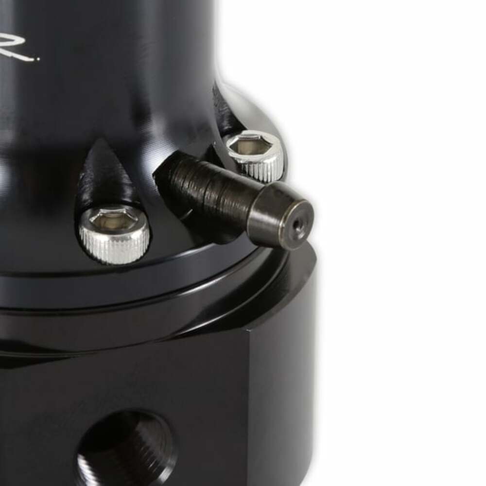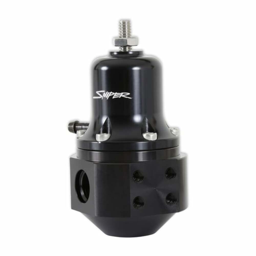 Sniper EFI universal bypass fuel pressure regulators are for use with fuel systems in street or track applications. They feature adjustable base pressure from 40-130 psi, a gauge port, and a boost reference port as well. These regulators are ideal for vehicles/systems where superior flow and pressure control are needed. These regulators are precision machined from 6061-T6 billet aluminum for strength and durability. They feature a black bright dip anodized body and a clear bright dip anodized top for corrosion resistance and good looks.