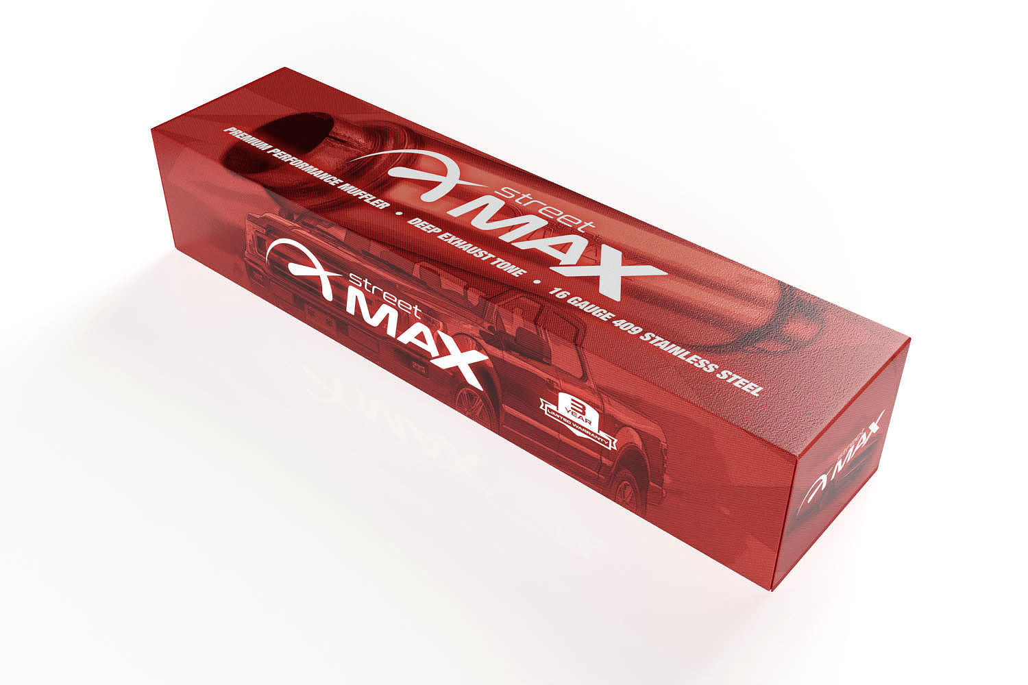 Street Max, Stainless Straight-Through Performance Muffler, 7.0" x 20.0" Round Body, Moderate Tone, 16-Gauge 409-Grade Stainless Steel, Satin Finish, 4.0" Center In, 4.0" Center Out, Reversible, 3 Year Limited Warranty.