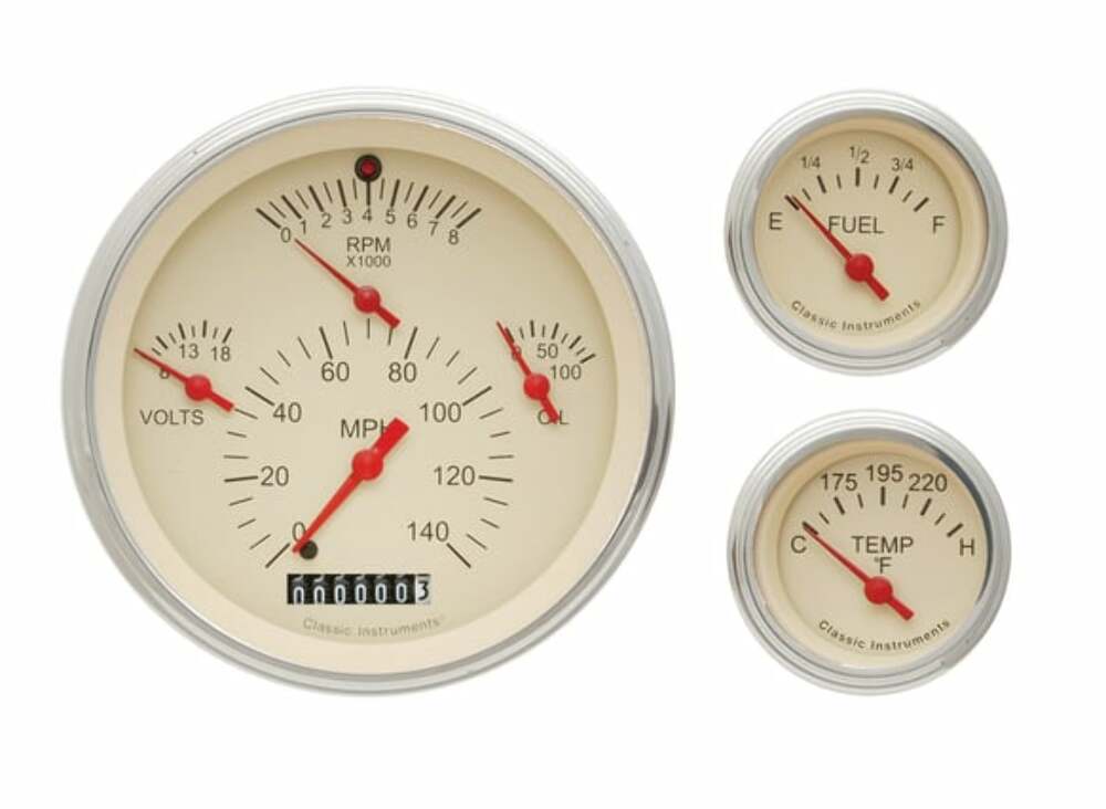 1957 Chevy Tan Package 4 5/8" Speedometer 140 MPH, Tachometer 8,000 RPM, Oil, & Volt 2 1/8" Fuel (0-30 OHM), & Temp with Stainless Low Step Bezel Flat Glass Lens. Works directly with ECM or VSS signals, no additional control boxes are needed. Fuel sending unit not included, gauge is calibrated to stock 0-30 OHM