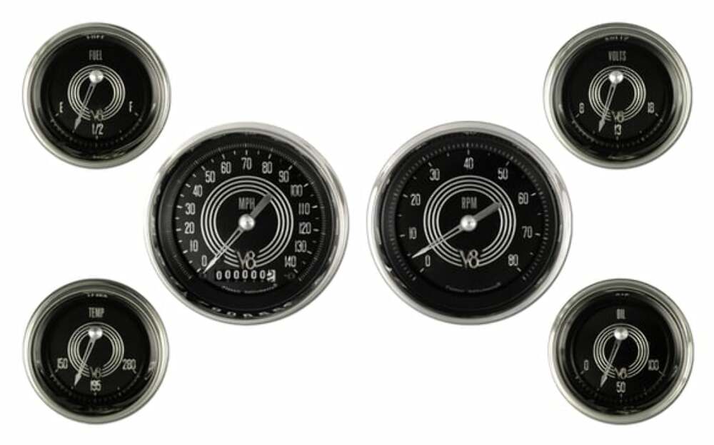 V8 Speedster Series 3 3/8" Speedo, Tach, 2 1/8" Fuel, Oil, Temp, Volt with Stainless High Step Bezel Curved Glass Lens