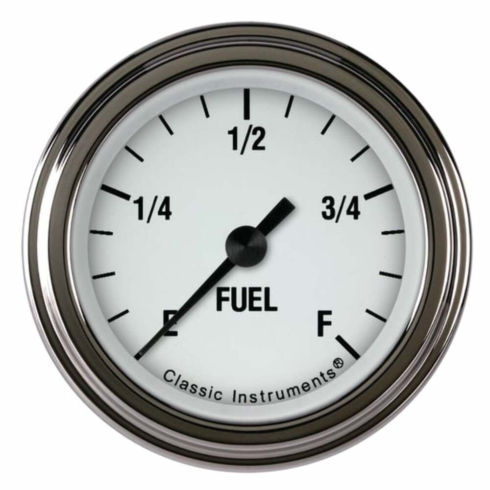 White Hot 2 1/8" Full sweep fuel level gauge with standard stainless low step bezel and flat glass lens.