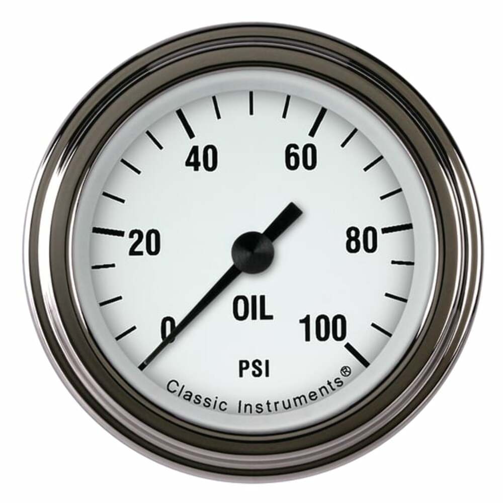 White Hot 2 1/8" Full sweep Oil Pressure gauge, 100psi, with standard stainless low step bezel and flat glass lens.