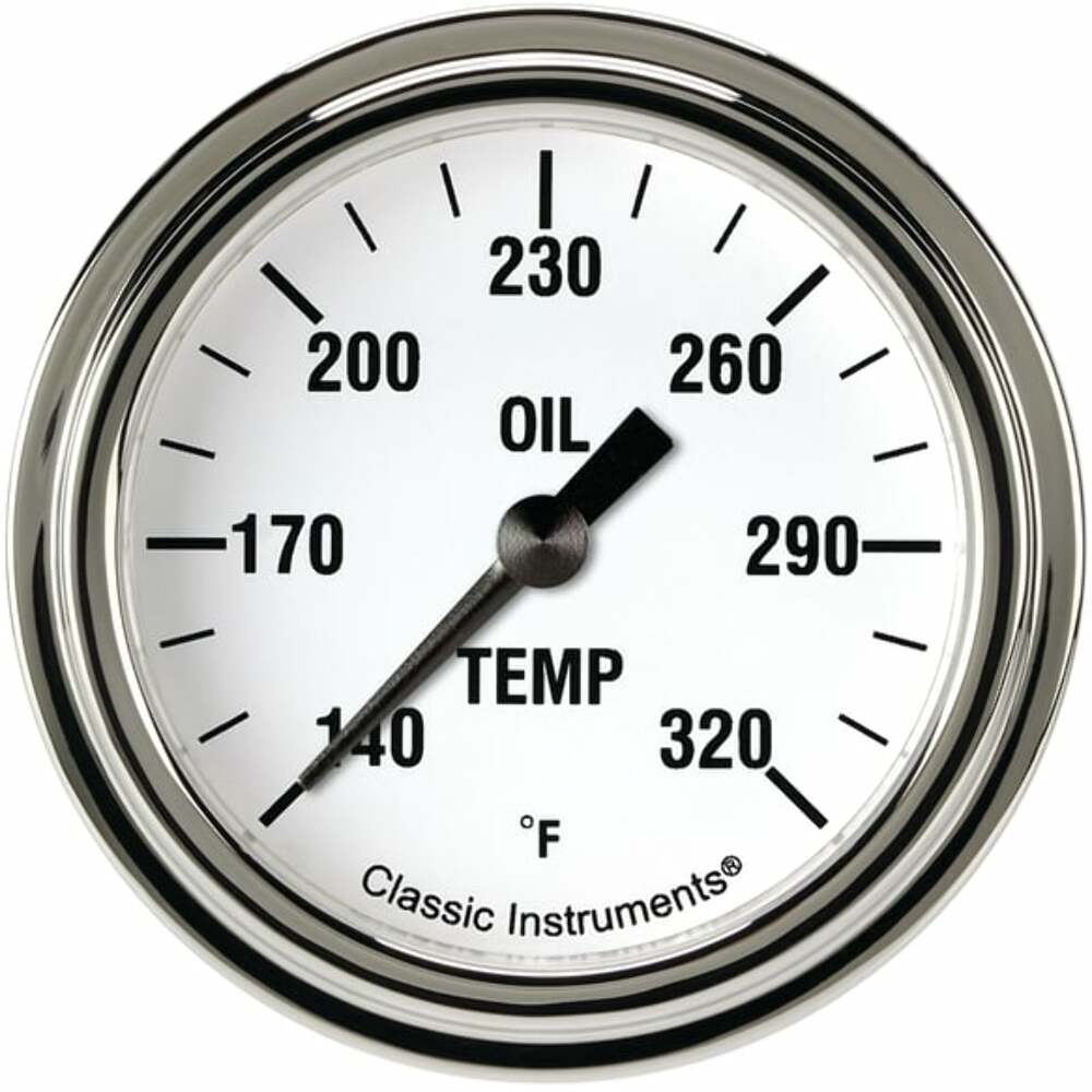 White Hot 2 5/8" Full sweep Oil Temperature gauge with standard stainless low step bezel and flat glass lens.