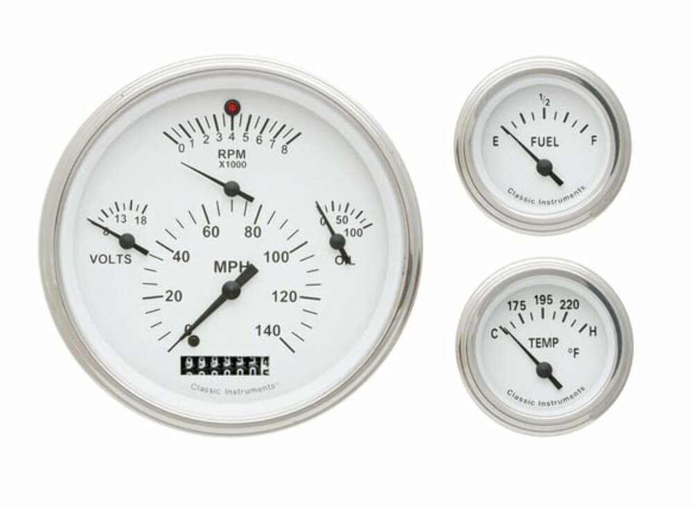 1957 Chevy White Package 4 5/8" Speedometer 140 MPH, Tachometer 8,000 RPM, Oil, & Volt 2 1/8" Fuel (0-30 OHM), & Temp with Stainless Low Step Bezel Flat Glass Lens. Works directly with ECM or VSS signals, no additional control boxes are needed. Fuel sending unit not included, Gauge is calibrated to stock 0-30 OHM